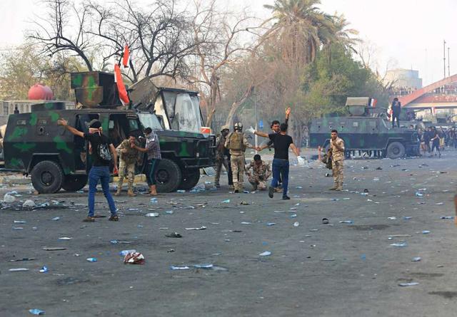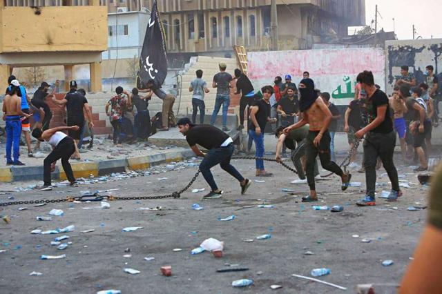 Protesters chant anti government slogans while security forces prevent them from storming the governor's building during protests demanding better public services and jobs in Basra, 340 miles (550 km) southeast ... more