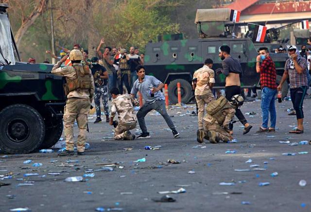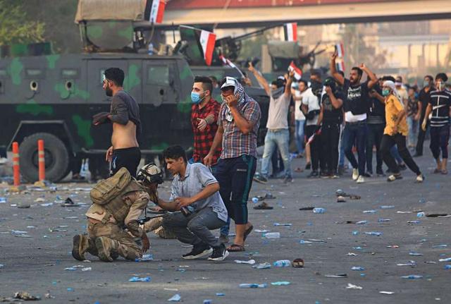An Iraqi soldier affected by tear gas is helped by several protesters during demonstrations where people are demanding better public services and jobs, in Basra, 340 miles (550 km) southeast of Baghdad, Iraq, ... more