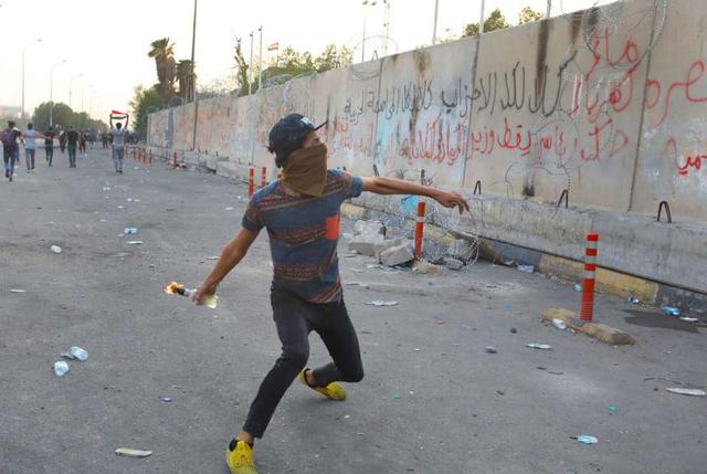 A protester throws a Molotov cocktail toward the governor's building during protests demanding better public services and jobs in Basra, 340 miles (550 km) southeast of Baghdad, Iraq, Wednesday, Sept. 5, 2018. ... more