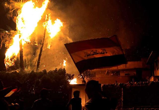 Protesters wave national flags after burning the municipal complex during protests demanding better public services and jobs in Basra, 340 miles (550 km) southeast of Baghdad, Iraq, Wednesday, Sept. 5, 2018.