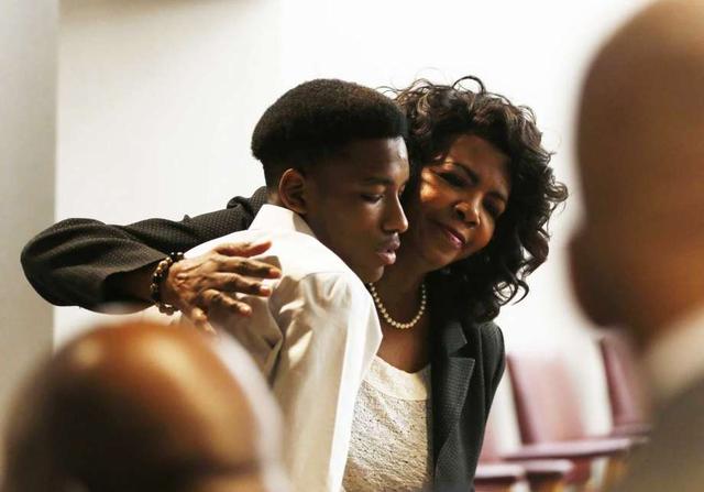 Dallas County District Attorney Faith Johnson hugs Kevon Edwards, the older brother of Jordan Edwards, during the trial of former Balch Springs police officer Roy Oliver, who is charged with the murder of 15-year-old Jordan Edwards, at the Frank Crowley Courts Building in Dallas on Monday, Aug. 27, 2018. (Rose Baca/The Dallas Morning News via AP, Pool) less