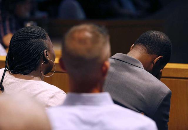 Odell Edwards, father of Jordan Edwards, drops his head to avoid seeing a crime scene photo during a closing argument in the trial of former Balch Springs police officer Roy Oliver, who is charged with the murder of 15-year-old Jordan Edwards, at the Frank Crowley Courts Building in Dallas on Monday, Aug. 27, 2018. (Rose Baca/The Dallas Morning News via AP, Pool) less