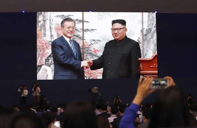 Members of media and volunteers watch a huge screen showing South Korean President Moon Jae-in, left, shake hands with North Korean leader Kim Jong Un after a joint press conference in Pyongyang, North Korea, ... more