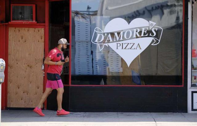 In this Monday, June 1, 2020 photo, an early morning jogger runs past a bordered D'Amores Pizza in the upscale Beverly Grove neighborhood of Los Angeles. After Bobby Alt's pizza shop was crippled for two months by the coronavirus pandemic, he reopened Saturday excited to finally dish out slices to customers in person. By the time he closed for the night, he feared the worst for his little business. A largely peaceful protest earlier in the day, which had delivered a steady flow of hungry customers, had given way to unruly groups of vandals tagging and breaking into businesses including his pizza shop. less