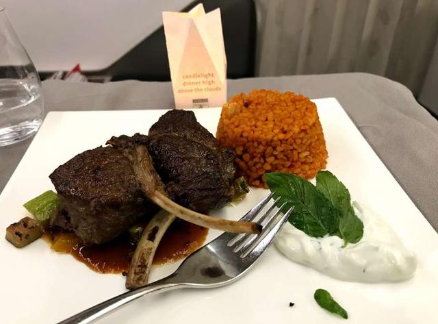 Turkish Airlines business class Istanbul-Toronto offered lamb pops, spicy rice and tzatziki. Nice! Photo: Chris McGinnis