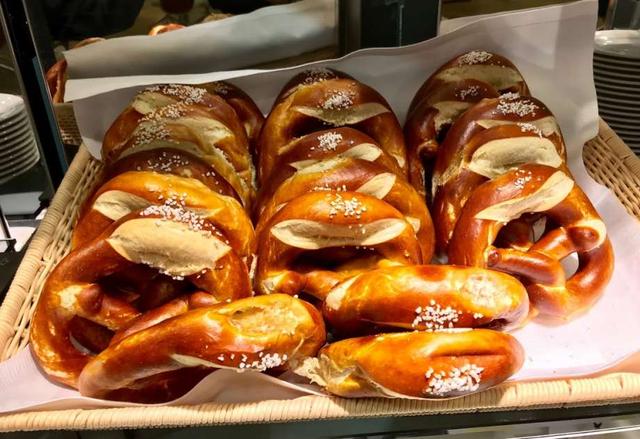 Lufthansa's business class Senator Lounge at Frankfurt had warm pretzels- fresh from the oven-- at the breakfast buffet in December. Nice touch! Photo: Chris McGinnis