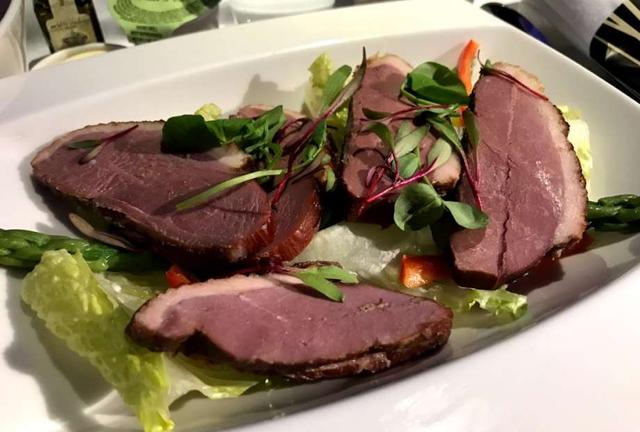Cathay Pacific business class SFO-Hong Kong at 1 am- smoked duck salad to start Photo: Chris McGinnis
