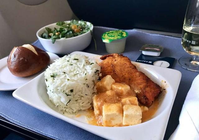 United first class domestic ATL-SFO dinner: Chicken tikka with fragrant rice, paneer, salad and pretzel roll Photo: Chris McGinnis