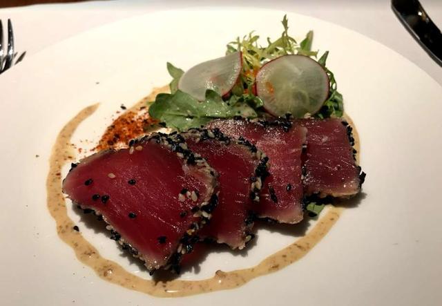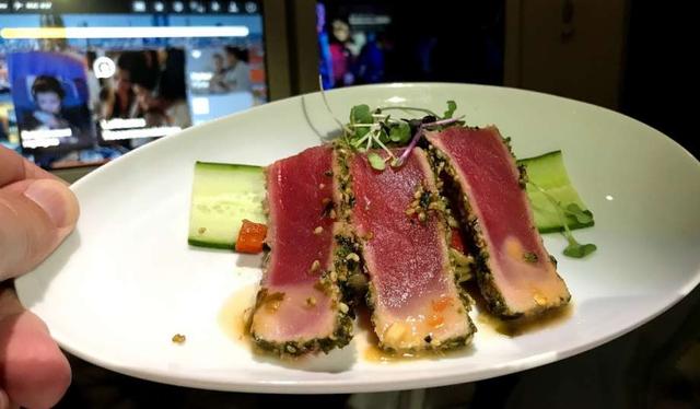 Cathay Pacific's The Pier first class lounge in Hong Kong has a fantastic restaurant with waiter service. This is a double order of the ahi tuna starter. Photo: Chris McGinnis