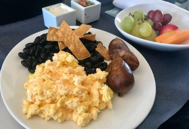 Alaska Airlines first class SFO-Mexico City- scrambled eggs, black beans, tortilla chips and sausage Photo: Chris McGinnis