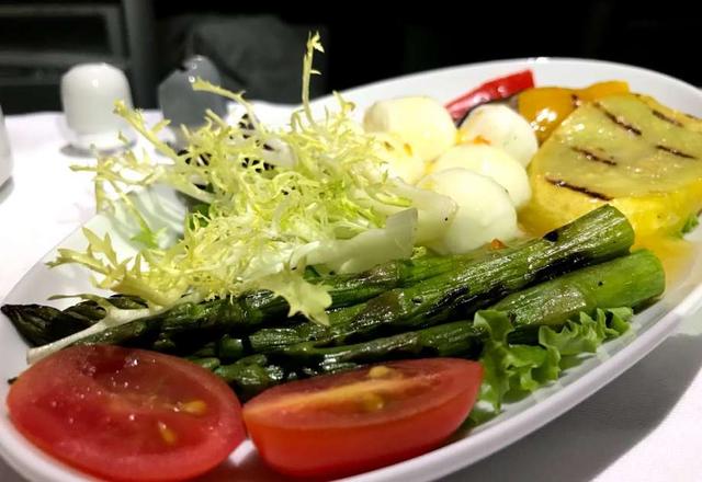 Lufthansa business class starter salad on SFO-Munich- grilled veggies with mozzarella balls Photo: Chris McGinnis