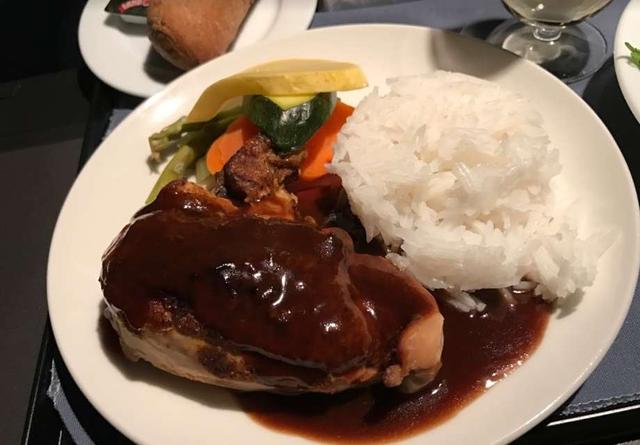 United Airlines first class Tampa-SFO bbq chicken with rice and roasted vegetables Photo: Chris McGinnis