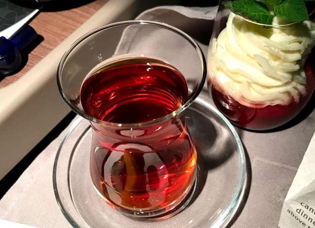 Turkish Airlines business class meals finish with a shapely cup of tea poured from a silver pot and a strawberry parfait-- along with a a flickering LED candle. Classy Photo: Chris McGinnis