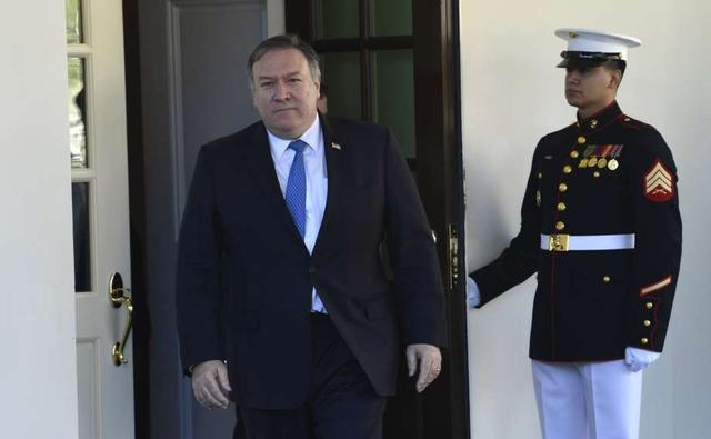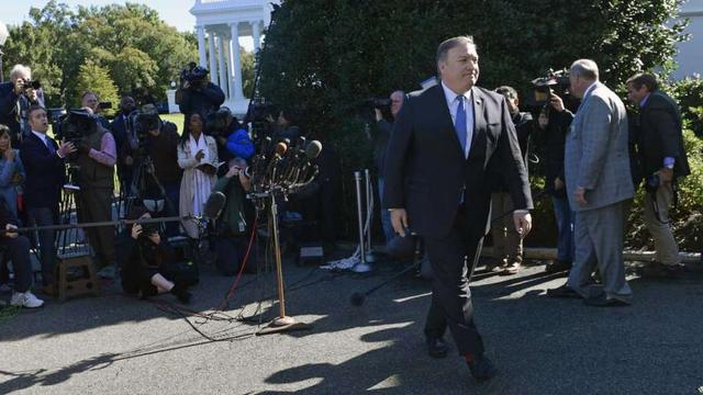 Secretary of State Mike Pompeo walks out to speak to reporters following his meeting with President Donald Trump in the Oval Office of the White House in Washington, Thursday, Oct. 18, 2018.
