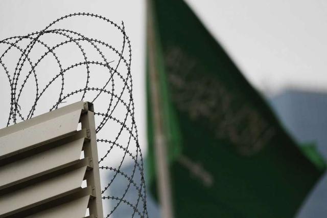 Behind barbed wire, Saudi Arabia's flag flies atop the country's consulate in Istanbul, Thursday, Oct. 18, 2018. Turkish crime-scene investigators finished an overnight search of both residence and a second search of the consulate itself amid Ankara's fears that Saudi writer Jamal Khashoggi was killed and dismembered inside the diplomatic mission in Istanbul. less