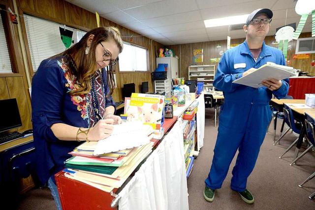 Keely Michalk (left) and Justin Collins make notes as they visit a portable classroom at Highland Park Elementary, where Principal Sissy Yeaman led a tour of the school, which is in need of repairs and upgrades ... more
