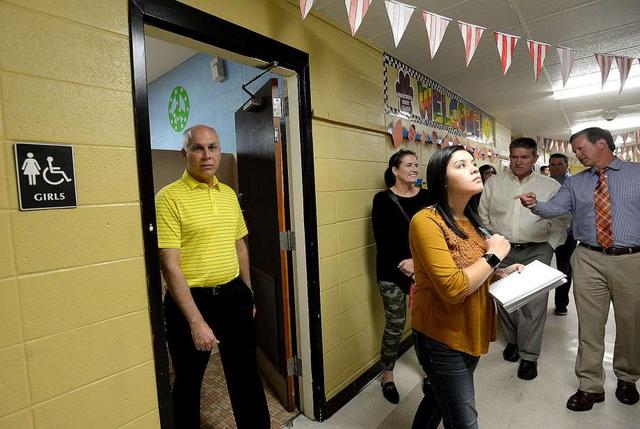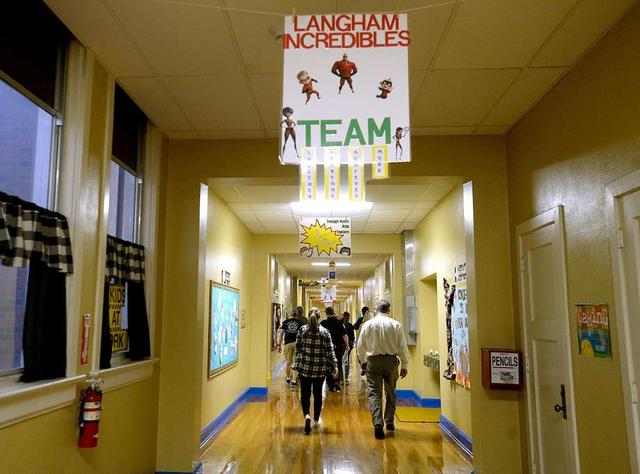 Participants make their way into Langham Elementary, which was one of two Nederland ISD elementary schools pen for public tours Monday, Oct. 22. NISD Citizens Advisory Committee hosted the tours and meeting as part of their 5-month study of the facilities to investigate need for repairs. The group hopes to pass a bond to upgrade the facilities, after a similar effort failed to pass in 2009. Photo taken Monday, October 22, 2018 Kim Brent/The Enterprise less