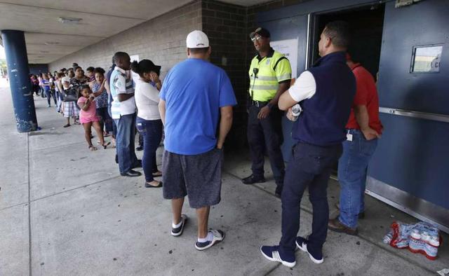 A police officer stands in the doorway as residents stand in a block-long line outside a customer help center staffed by Columbia Gas of Massachusetts in Lawrence, Mass., Monday, Sept. 17, 2018. Dozens of homes were destroyed or damaged, a teenager was killed and dozens of people were injured in Lawrence, North Andover and Andover following a failure last week in the area natural gas delivery service. Federal officials say their investigation is partially focused on pressure sensors that were connected to a gas line that was being taken out of service shortly before the blasts. less