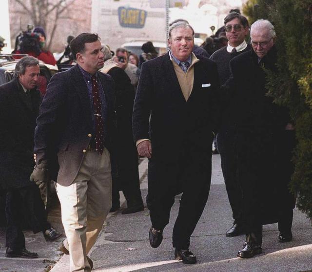 Michael Skakel, center, is led into Greenwich police headquarters by Frank Garr, right, where he was arrested and processed for the murder of Martha Moxley which occured on Oct 30th, 1975. Garr was the lead Greenwich police investigator on the case. At the far left is Skakel's lawyer, Mickey Sherman. Photo: Bob Luckey / GT