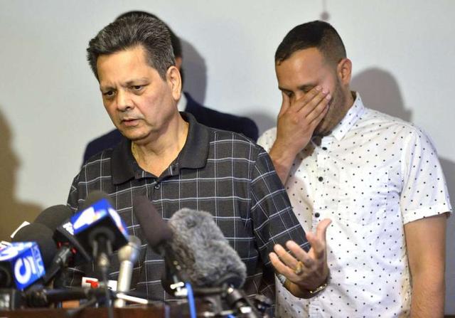 FILE - In this Aug. 26, 2019, file photo, Russell French speaks as his son Kevin reacts in Corona, Calif., during a news conference on a police shooting of the family. An off-duty Los Angeles police officer violated departmental policy in 2019 when he shot and killed Russell's other son Kenneth, a mentally ill man who had attacked him and his young son from behind in a Southern California Costco, the Los Angeles Board of Police Commissioners ruled Wednesday, June 10, 2020. Russell and his wife Paola will have lifelong medical problems as a result of the shooting, said Dale Galipo, an attorney for the French family. (Jeff Gritchen/The Orange County Register via AP, File) less