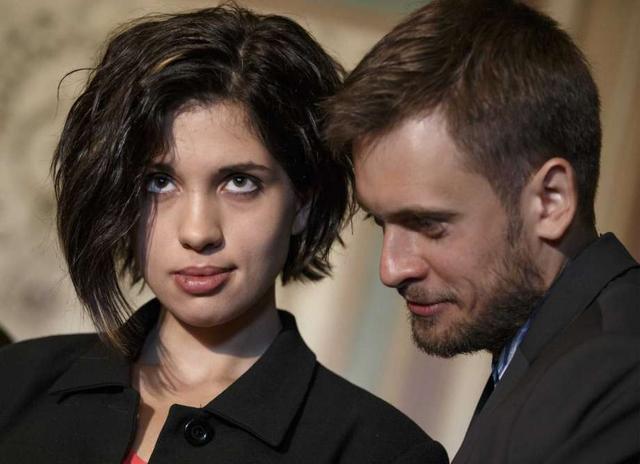 FILE - In this file photo taken on Tuesday, May 6, 2014, Russian political activist Nadya Tolokonnikova of the Russian punk band Pussy Riot, stands with her husband Pyotr Verzilov as they join Sen. Ben Cardin, ... more