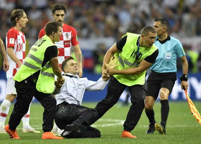 FILE - In this July 15, 2018, stewards pull Pyotr Verzilov, a member of the feminist protest group Pussy Riot off the pitch after he stormed onto the field and interrupted the final match between France and ... more