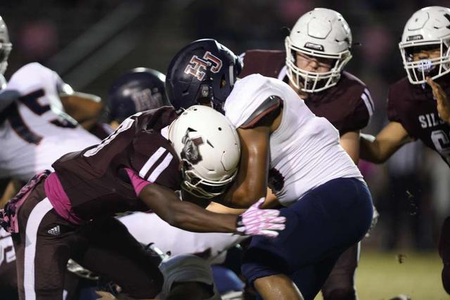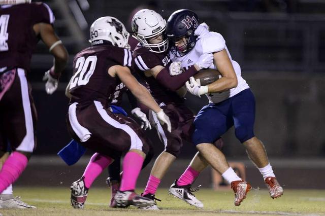 Hardin-Jefferson's Justin Smith is tackled by Silsbee players at Tiger Stadium on Friday night. Photo taken Friday 10/19/18 Ryan Pelham/The Enterprise