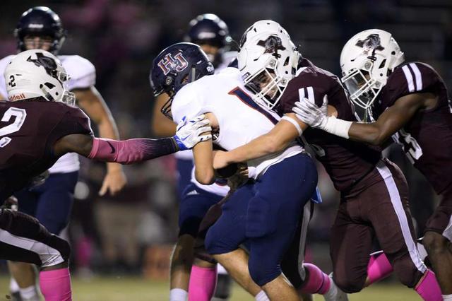 Hardin-Jefferson's Christian Bowie is hit by Silsbee defenders at Tiger Stadium on Friday night. Photo taken Friday 10/19/18 Ryan Pelham/The Enterprise