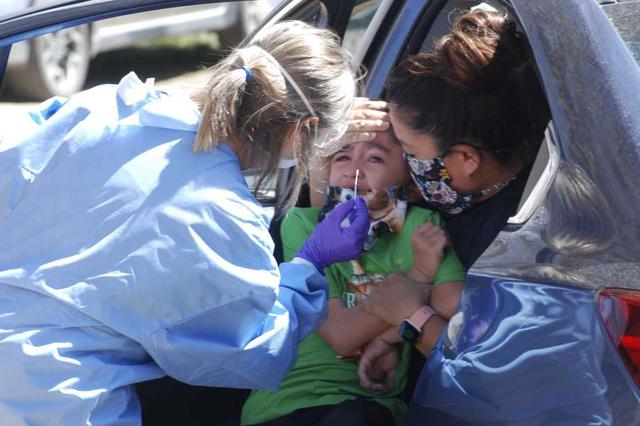 From the bed of a pickup truck and backseats of cars, wide-eyed children stared from behind hand-sewn masks and then sobbed as testing crews in hospital gowns swabbed their noses. The workers packed the samples into a plastic travel cooler for a return trip past the tribe's guarded roadblock to a state lab.