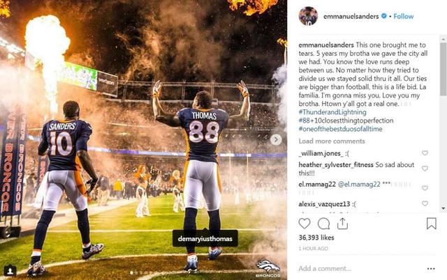 Teammates love himIt's hard to find a teammate that has anything bad to say about Thomas. Several players took to social media to express their appreciation to Thomas after the trade was announced, including this Instagram post from fellow receiver Emmanuel Sanders.