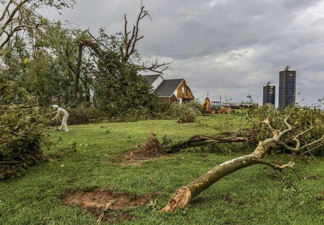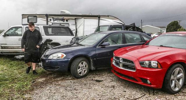 Sean Hagan surveys the damage from a tornado in his family's driveway where a camper trailer was pushed up into the air, damaging several cars, Saturday, Sept. 8, 2018, in Stanley, Ky. There was moderate to ... more
