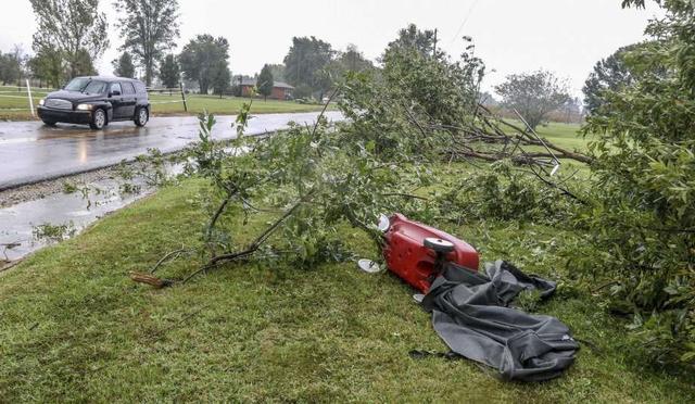 A wagon and a grill cover lays among downed trees after a tornado swept through Stanley, Ky., Saturday, Sept. 8, 2018. (Greg Eans/The Messenger-Inquirer via AP)