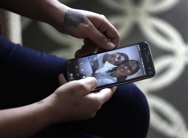 During an interview with The Associated Press Wednesday, June 27, 2018, in Evanston, Illinois, Lidia Karine Souza, who is seeking asylum from Brazil, flips through her phone at photographs of her and her son Diogo as she talks about the ordeal she has lived in searching for and finally seeing her son for the first time on Tuesday. It took Souza weeks to find Diogo after he was taken from her at the Texas border in late May and sent by the government to a Chicago shelter. Photo: Charles Rex Arbogast, AP / Copyright 2018 The Associated Press. All rights reserved.