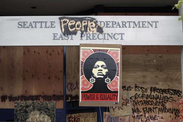 A 1970's-era poster of activist Angela Davis hangs at a boarded up and closed Seattle police precinct Sunday, June 21, 2020, in Seattle, where streets are blocked off in what has been named the Capitol Hill Occupied Protest zone. Police pulled back from several blocks of the city's Capitol Hill neighborhood near the Police Department's East Precinct building earlier in the month after clashes with people protesting the death of George Floyd, a Black man who died after being restrained by Minneapolis police officers on May 25. less
