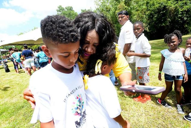 Sheryl Jackson hugs Noah and Nadia Chachere during the It Takes A Village organization's back-to-school event at her home Saturday. Families could register for backpacks, school uniforms and other supplies ... more