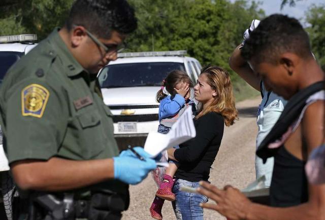 Jeny Patricia Figueroa Fernandez, 27, and her three-year-old daughter, Dolores, wait as U.S. Border Patrol Supervisory Agent Christian Alvarez interviews other immigrants near the Anzalduas International Bridge ... more