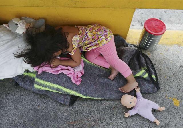 Two-year-old Violet Estrada, from Honduras, naps on a blanket on the Mexican side of the Roma-Ciudad Miguel Aleman International Bridge by Roma, Texas, Tuesday, June 5, 2018. The toddler is with her father and they have been waiting on the bridge for 11 days. Amid this new era of a "zero-tolerance" policy toward immigrants in the United States, those seeking asylum through the United States' legal ports of entry --namely, the international bridges--are being denied entry. They've been told by agents that DHS facilities are overwhelmed. less