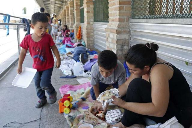 Honduran immigrant Ada Santos, 29, hands out donated roasted chicken to children as immigrants from Central America and Cuba camp on the U.S. side of the McAllen-Hidalgo-Reynosa International Bridge, Tuesday, June 5, 2018. The immigrants are waiting, some for five days, hoping for asylum in the U.S. less