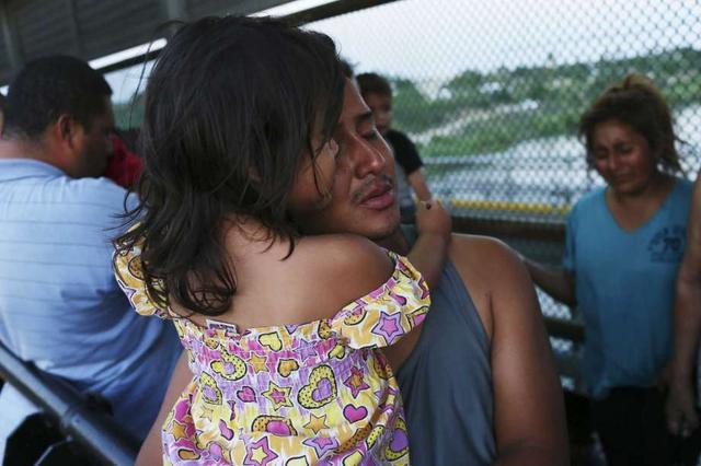 During prayer, Marco Estrada, 25, hugs his daughter, Violet, 2, on the Mexican side of the Roma-Ciudad Miguel Aleman International Bridge, Tuesday, June 5, 2018. More than 50 mostly Central American immigrants ... more