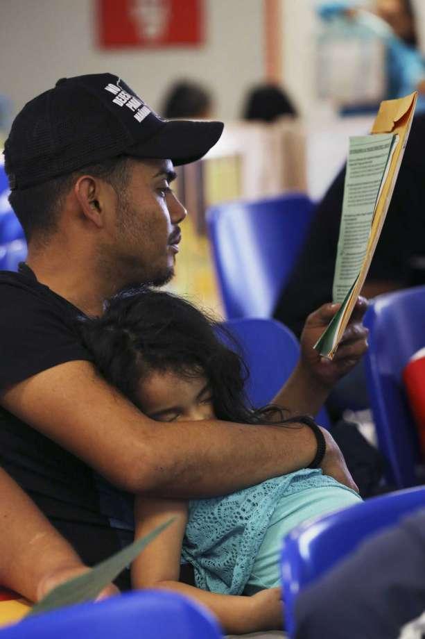 Ariel Benancio Janiz Rivera, 37, holds his tired daughter, Adriana, 3, while reading a paper with immigrants rights and duties at the Catholic Charities of the Rio Grande Valley Humanitarian Respite Center in McAllen, Texas, Wednesday, May 9, 2018. The Honduran family was just release from an immigration detention center and were headed to Virginia. less