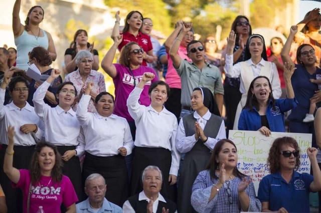 Girlie Gary, of Mandeville, Louisiana, joins members of different faiths for a vigil and prayer walk organized by Catholic Charities of the Rio Grande Valley at Archer Park in McAllen, Texas, Wednesday, June ... more