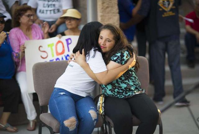 Dolores Huerta, right, speaks with Maria, center, who was separated from her seven-year-old daughter by U.S. Customs and Border Protection and does not know where she is, and Miriam, left, who is separated from ... more
