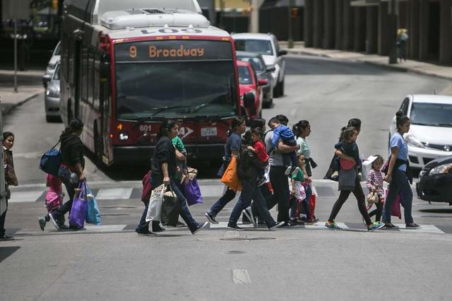 Immigrants cross Pecan St. to get to the San Antonio Greyhound Bus station afer being released from federal detention centers in South Texas June 22, 2018.