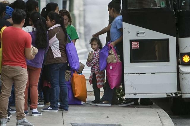 Immigrants wait to get on buses at the San Antonio Greyhound Bus station afer being released from federal detention June 22, 2018.