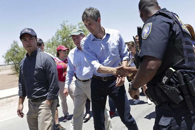 U.S. Rep. Joaquin Castro, from left, U.S. Senator Tom Udall and U.S. Rep. Beto O'Rourke walk towards the entrance of the "tent city," built to house immigrant children separated from their parents after ... more