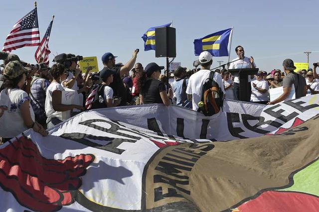 Participants take part in the Voto Latino StopSeparation.org rally outside the "tent city," for immigrant children separated from their parents after crossing illegally into the U.S. or seeking asylum, at the Marcelino Serna Port of Entry in Tornillo on June 24, 2018. less