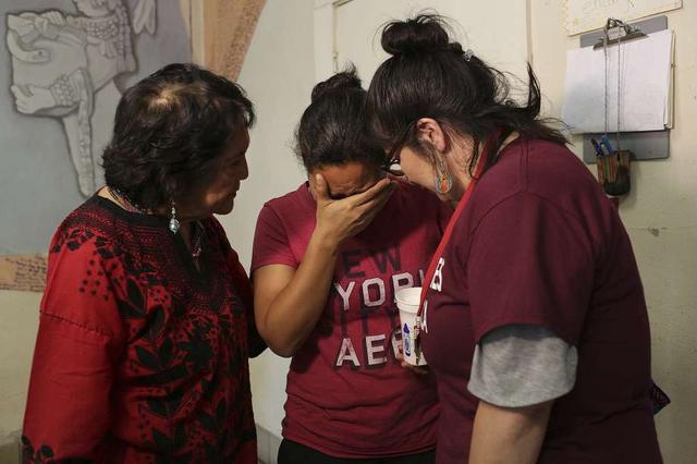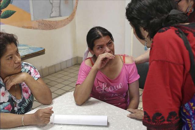 Iris, who is separated from her six-year-old son, talks with Dolores Huerta, left, and Delia Garcia, right, at Casa Vides, an Annuciation House migrant shelter, in El Paso on Monday, June 25, 2018. 32 parents who were separated from their children by U.S. Customs and Border Protection were released to Casa Vides on Sunday. Huerta is the co-founder, with Cesar Chavez, of the National Farmworkers Association and Delia Garcia, an alum of St. Mary's University, is the Executive Director of The National Migrant and Seasonal Head Start Association. less