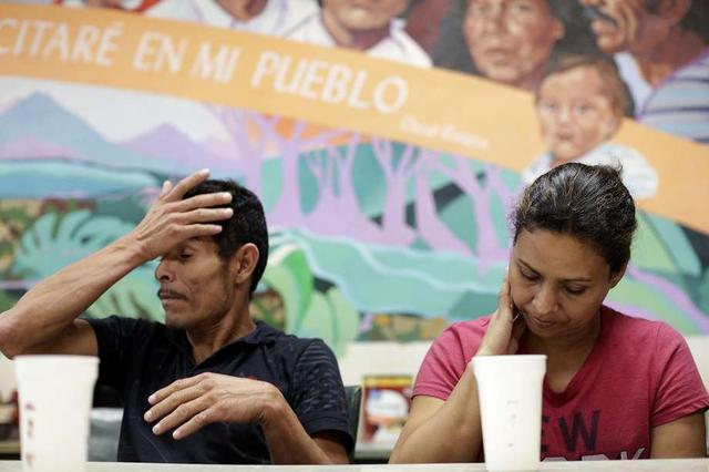 Nelvin and Iris, both of Honduras, wait as other parents speak about being separated from their children by U.S. Customs and Border Protection, during a press conference at Casa Vides, an Annuciation House ... more
