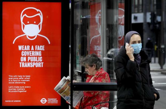 Passengers wait at a bus stop with a sign advising travellers to wear a face covering whilst travelling, in London, Friday, June 5, 2020. It will become compulsory to wear face coverings whilst using public transport in England from Monday June 15. less