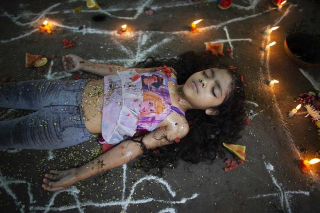 Other men lay motionless and face-up in the dirt amid candles and elaborate drawings in white power as onlookers pass through them and step over their bodies.